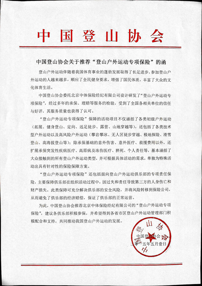 随着全国户外运动的迅猛发展,越来越多的人开始参与户外运动。为全面贯彻中国登山协会营造全民健身氛围,普及和推广户外运动项目的宗旨,北京飞艇168官方开奖结果记录在中国登山协会的支持下,对户外运动专项保险各项数据进行汇总、分析,在现有产品基础上,进行充分的市场调研,与专业的保险公司联合开发的“登山户外运动风险管理和保险服务平台”开通了!“登山户外运动网上风险管理和保险服务平台”是在登山及户外运动专项保险基础上专门针对于广大登山户外运动网站、论坛,户外爱好者、自助旅游爱好者的风险管理与保险服务平台,旨在发挥保险的社会管理功能,为广大的登山户外爱好者解除后顾之忧,进一步为我国登山户外运动的健康发展提供一份保障。