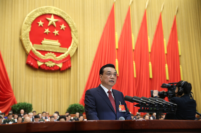 3月5日,第十二届全国人民代表大会第三次会议在北京人民大会堂开幕。国务院总理李克强作政府工作报告。新华社记者 庞兴雷 摄各位代表:现在,我代表国务院,向大会报告政府工作,请予审议,并请全国政协各位委员提出意见。一、2014年工作回顾过去一年,我国发展面临的国际国内环境复杂严峻。全球经济复苏艰难曲折,主要经济体走势分化。国内经济下行压力持续加大,多重困难和挑战相互交织。在以习近平同志为总书记的党中央坚强领导下,全国各族人民万众一心,克难攻坚,完成了全年经济社会发展主要目标任务,全面建成小康社会迈出坚实步伐,全面深化改革实现良好开局,全面依法治国开启新征程,全面从严治党取得新进展。一年来,我国经济社会发展总体平稳,稳中有进。“稳”的主要标志是,经济运行处于合理区间。增速稳,国内生产总值达到63.6万亿元,比上年增长7.4%,在世界主要经济体中名列前茅。就业稳,城镇新增就业1322万人,高于上年。价格稳,居民消费价格上涨2%。“进”的总体特征是,发展的协调性和可持续性增强。经济结构有新的优化,粮食产量达到6.07亿吨,消费对经济增长的贡献率上升3个百分点,达到51.2%,服务业增加值比重由46.9%提高到48.2%,新产业、新业态、新商业模式不断涌现。中西部地区经济增速快于东部地区。发展质量有新的提升,一般公共预算收入增长8.6%,研究与试验发展经费支出与国内生产总值之比超过2%,能耗强度下降4.8%,是近年来最大降幅。人民生活有新的改善,全国居民人均可支配收入实际增长8%,快于经济增长;农村居民人均可支配收入实际增长9.2%,快于城镇居民收入增长;农村贫困人口减少1232万人;6600多万农村人口饮水安全问题得到解决;出境旅游超过1亿人次。改革开放有新的突破,全面深化改革系列重点任务启动实施,本届政府减少1/3行政审批事项的目标提前实现。这份成绩单的确来之不易,它凝聚着全国各族人民的心血和汗水,坚定了我们奋勇前行的决心和信心。过去一年,困难和挑战比预想的大。我们迎难而上,主要做了以下工作。一是在区间调控基础上实施定向调控,保持经济稳定增长。面对经济下行压力加大态势,我们保持战略定力,稳定宏观经济政策,没有采取短期强刺激措施,而是继续创新宏观调控思路和方式,实行定向调控,激活力、补短板、强实体。把握经济运行合理区间的上下限,抓住发展中的突出矛盾和结构性问题,定向施策,聚焦靶心,精准发力。向促改革要动力,向调结构要助力,向惠民生要潜力,既扩大市场需求,又增加有效供给,努力做到结构调优而不失速。有效实施积极的财政政策和稳健的货币政策。实行定向减税和普遍性降费,拓宽小微企业税收优惠政策范围,扩大“营改增”试点。加快财政支出进度,积极盘活存量资金。灵活运用货币政策工具,采取定向降准、定向再贷款、非对称降息等措施,加大对经济社会发展薄弱环节的支持力度,小微企业、“三农”贷款增速比各项贷款平均增速分别高4.2和0.7个百分点。同时,完善金融监管,坚决守住不发生区域性系统性风险的底线。二是深化改革开放,激发经济社会发展活力。针对束缚发展的体制机制障碍,我们通过全面深化改革,以释放市场活力对冲经济下行压力,啃了不少硬骨头,经济、政治、文化、社会、生态文明等体制改革全面推进。扎实推动重点改革。制定并实施深化财税体制改革总体方案,预算管理制度和税制改革取得重要进展,专项转移支付项目比上年减少1/3以上,一般性转移支付比重增加,地方政府性债务管理得到加强。存款利率和汇率浮动区间扩大,民营银行试点迈出新步伐,“沪港通”试点启动,外汇储备、保险资金运用范围拓展。能源、交通、环保、通信等领域价格改革加快。启动科技资金管理、考试招生、户籍、机关事业单位养老保险制度等改革。继续把简政放权、放管结合作为改革的重头戏。国务院各部门全年取消和下放246项行政审批事项,取消评比达标表彰项目29项、职业资格许可和认定事项149项,再次修订投资项目核准目录,大幅缩减核准范围。着力改革商事制度,新登记注册市场主体达到1293万户,其中新登记注册企业增长45.9%,形成新的创业热潮。经济增速放缓,新增就业不降反增,显示了改革的巨大威力和市场的无限潜力。以开放促改革促发展。扩展上海自由贸易试验区范围,新设广东、天津、福建自由贸易试验区。稳定出口,增加进口,出口占国际市场份额继续提升。实际使用外商直接投资1196亿美元,居世界首位。对外直接投资1029亿美元,与利用外资并驾齐驱。中国与冰岛、瑞士自贸区启动实施,中韩、中澳自贸区完成实质性谈判。铁路、电力、油气、通信等领域对外合作取得重要成果,中国装备正大步走向世界。