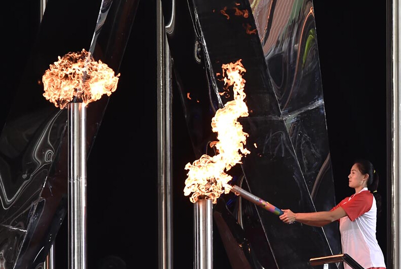 10月18日,中华人民共和国第一届青年运动会开幕式在福州市海峡奥体中心举行。图为女子沙排世锦赛冠军薛晨点燃赛会主火炬的瞬间。中体在线图片 倪敏哲 摄